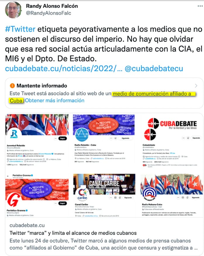 Por cierto, los algoritmos a veces traicionan a Twitter. En un tuit con link a Cubadebate que puse en mi cuenta el pasado lunes, la red advierte sobre la filiación de este portal digital no al Gobierno sino a Cuba.