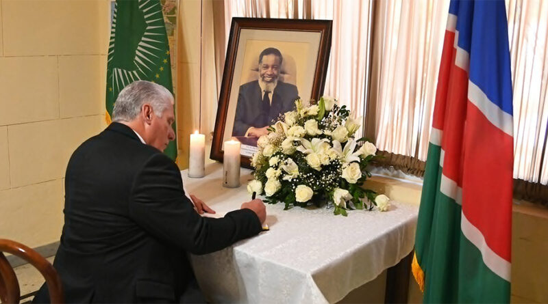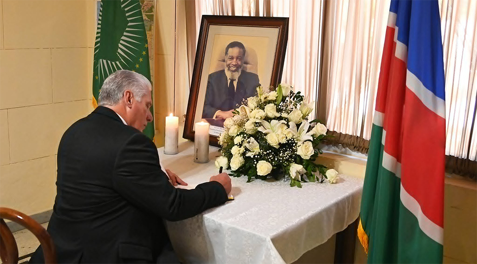 El primer secretario del Comité Central del PCC y presidente de Cuba, Miguel Díaz-Canel, firmó este martes el libro de condolencias abierto en la embajada de Namibia en La Habana con motivo del fallecimiento del Padre Fundador de ese país africano, Sam Nujoma.