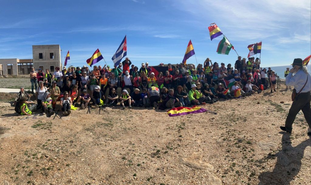Hoy en la marcha han participado 180 personas, 96 mujeres y 84 hombres. La misma etapa del año pasado, la recorrieron 151 personas, 81 hombres y 70 mujeres. Hacemos una parada obligatoria a la entrada de Balerma, entidad local, perteneciente al municipio del Ejido. Familiares, amistades y gente del pueblo, portando banderas republicanas, nos esperan para dar un último adiós, a Antonio López de Balerma, el compañero que murió hace prácticamente una semana, y que por primera vez, en todas sus ediciones, había faltado a la cita de la salida de Málaga. José Antonio Berenguer en nombre de la Asociación y una vecina y amiga en nombre de toda la gente de Balerma, han dicho unas palabras de recuerdo de Antonio López. A ambos se les ha quebrado la voz al hablar. Una mujer de 88 años, vecina de Balerma, grita con voz bastante potente, ¡¡Viva la República!! ¡¡Viva la Desbandá!! ¡¡Va por ti, Antonio!! Su mujer también toma la palabra, para prometer, que la familia seguirá peleando para que el paseo donde estamos celebrando el acto, sea denominado Norman Bethune, cosa que era un proyecto de su marido. Se trata de un pequeño paseo marítimo, que desde donde estamos, se contempla, majestuosamente nevada, la cumbre del Mulhacén. La bandera del Partido de la Izquierda Europea, que regalaron a Antonio López, una delegación de ese partido del parlamento europeo, hace varios años, al participar en un acto de la Desbandá, se llevará en las próximas marchas, guardándose el resto del año, en la casa de su familia.