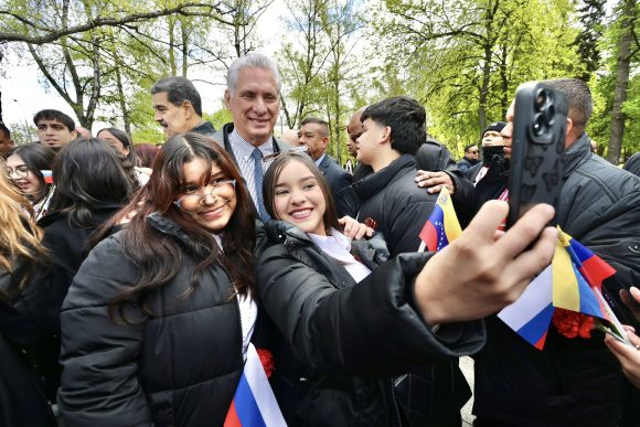 Díaz-Canel y Maduro recordaron la trascendencia de la victoria en la Gran Guerra Patria y el papel trascendental que jugó el pueblo ruso para vencer al fascismo. También compartieron allí con jóvenes venezolanos.
