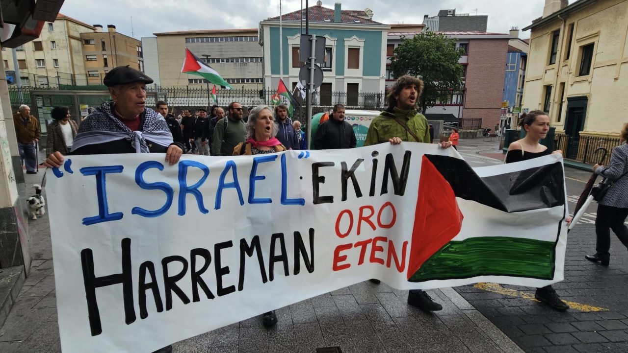 La manifestación recorrió todo el centro de este pueblo de Bizkaia, escrachando a las empresas cómplices de los genocidas sionistas. Para ello, en el transcurso de la marcha se detuvieron frente al BBVA, Kutxabank, el Banco Santander, los supermercados Eroski y BM, el Metro de Bilbao (que ha contratado personal de seguridad con la empresa israelí I-CEC, filial de la multinacional ICTS International, cuya dirección está vinculada con los militares israelíes) y otros establecimientos, donde entraron a los locales y pegaron carteles y pegatinas denunciando su complicidad con los asesinos israelíes.