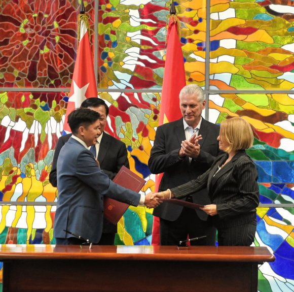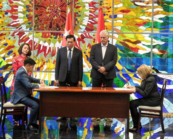 En presencia del primer secretario del Comité Central del Partido Comunista y presidente de la República, Miguel Díaz-Canel Bermúdez, y el viceministro de Salud de la República Socialista de Vietnam, Do Xuan Tuyen, se firmó en la tarde de este lunes el acuerdo mediante el cual quedó constituida la Empresa Mixta, entre la empresa cubana BCF S.A, de BioCubaFarma, y la empresa vietnamita, Genfarma Holdings.