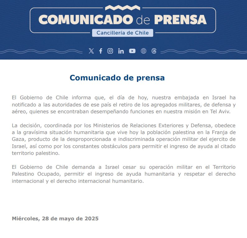 El Gobierno de Chile demanda a Israel cesar su operación militar en el territorio palestino ocupado y respetar el derecho internacional y el derecho internacional humanitario, añade el comunicado.