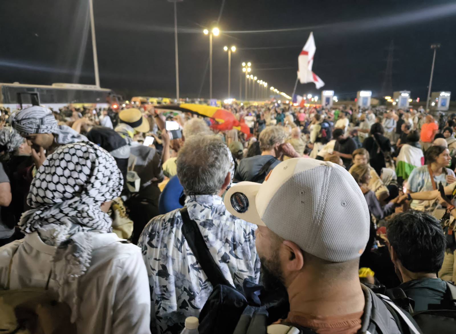 Pasando mucho calor, en pleno desierto de Ismailia, la decisión era mantenerse en el control número 2 hasta que nos devolvieran los pasaportes y nos dejaran seguir hacia el punto de encuentro en el hotel de Ismailia. Los pasaportes los repartieron de modo caótico. A personas voluntarias de la Marcha , les daban tacos de pasaportes, que debían pregonar a numerosas personas que se agolpaban para recuperar el suyo. Este proceso duró durante todo el atardecer. La gente sacó sus banderas palestinas y kufiyas y en algunos casos, las banderas de sus países. Era el caso de la delegación sudafricana a la que estuvo arengando el nieto de Nelson Mandela.