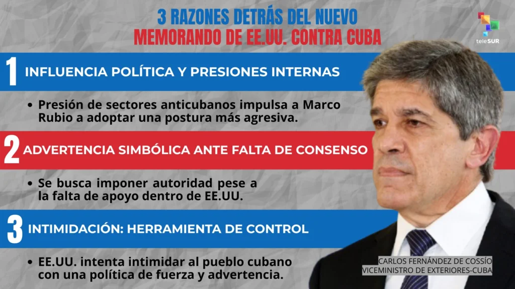 El viceministro de Relaciones Exteriores de Cuba (Cubaminrex), Carlos Fernández de Cossío, explicó este miércoles todo lo concerniente al recientemente anunciado Memorando de Estados Unidos (EE.UU.) contra el Gobierno y pueblo cubano que, de acuerdo con el diplomático, tiene detrás la influencia del secretario de Estado de EE.UU., Marco Rubio, y los sectores anticubanos.