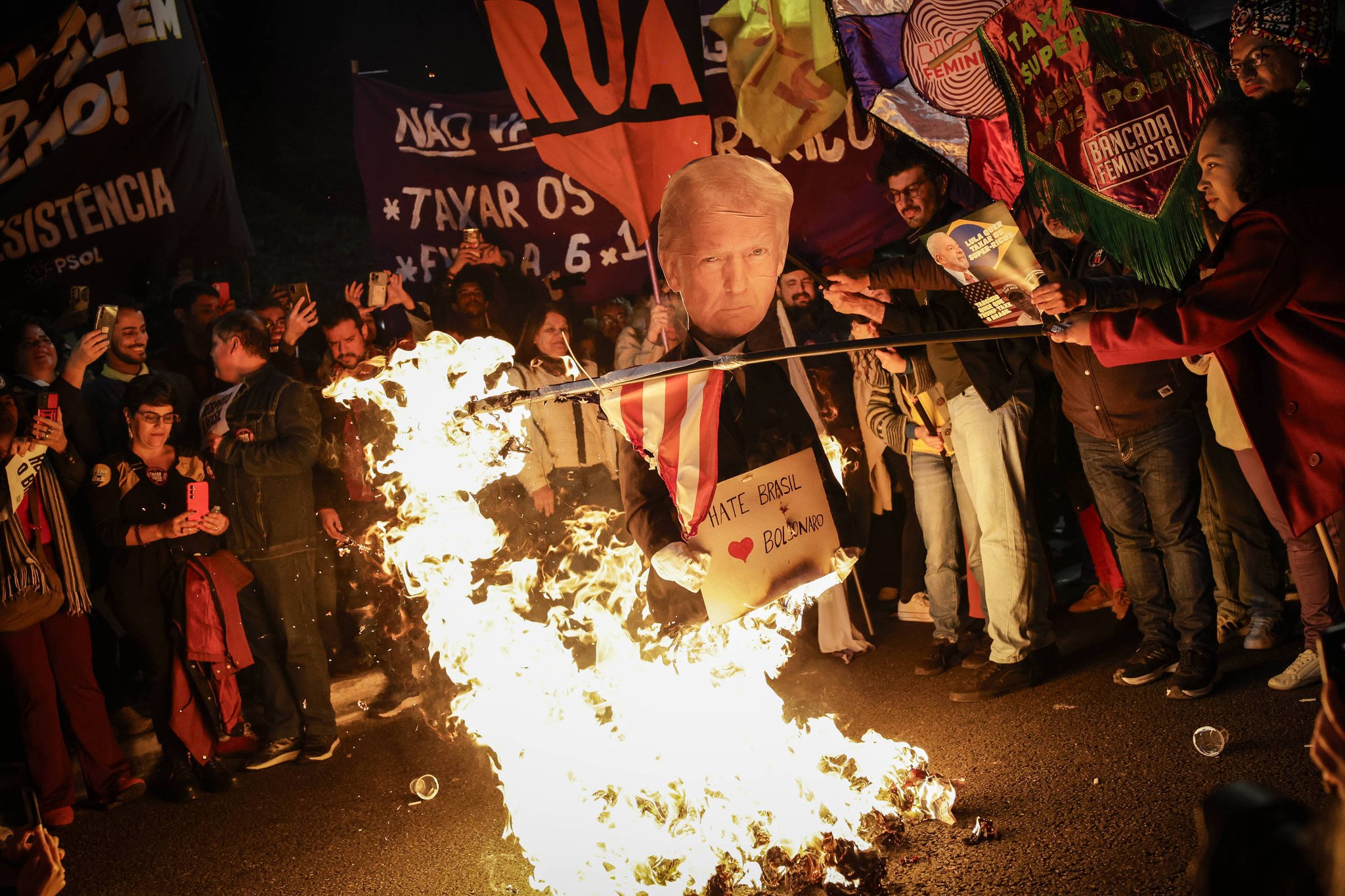Congregada en la fachada del Museo de Arte una gran multitud prendió fuego a una efigie de Trump y una bandera estadounidense, denunciando la injerencia del magnate republicano en los asuntos internos de su país y atentar contra la soberanía nacional de Brasil. Algunos manifestantes también alzaban carteles con la cara tachada de Trump y la inscripción “Enemigo del pueblo”.