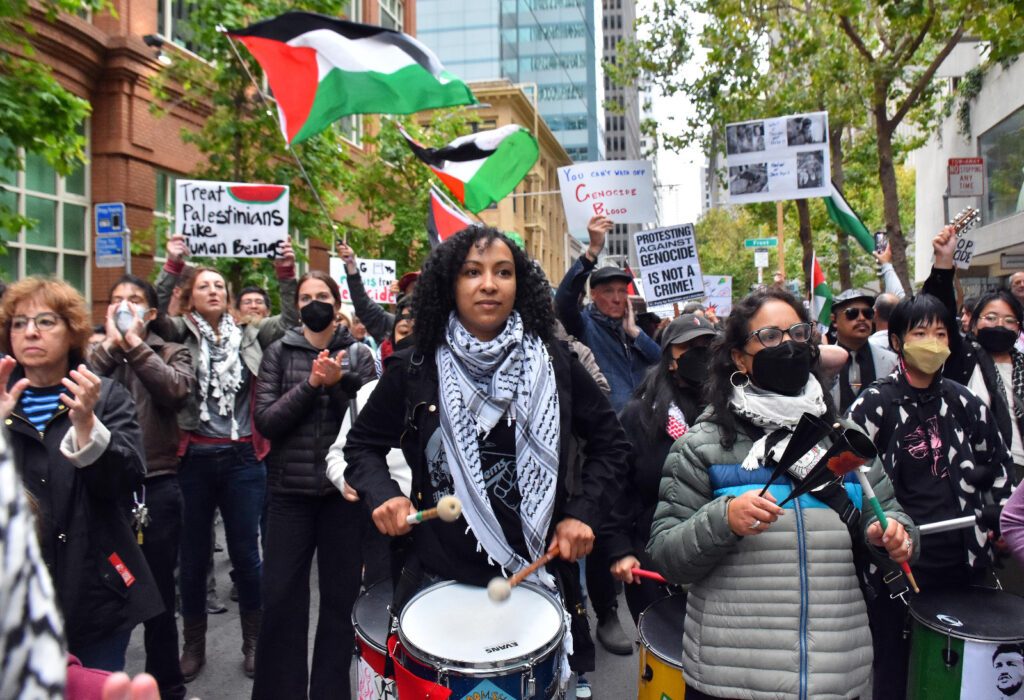 Una manifestación convocada hace menos de un día reunió a cientos de personas que marcharon hacia las oficinas del Boston Consulting Group (BCG) en el distrito financiero de San Francisco.