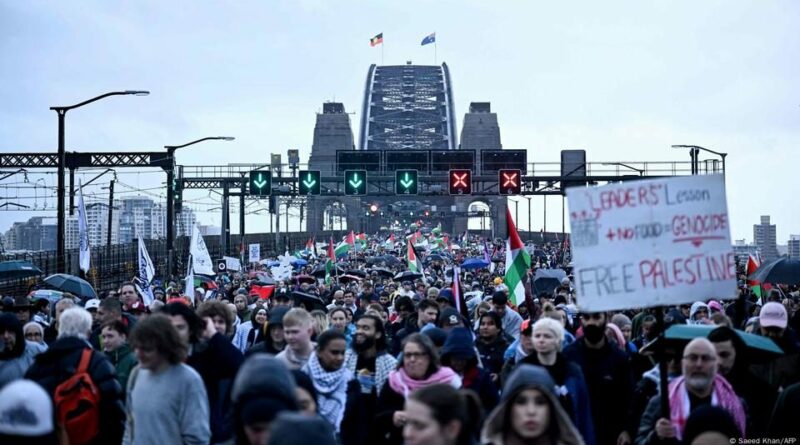 Decenas de miles de manifestantes propalestinos, entre ellos el fundador de Wikileaks, Julian Assange, marcharon este domingo por el puente del puerto de Sídney en una protesta que paralizó ese emblemático lugar.