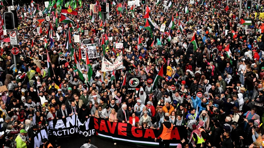 La senadora de izquierda Mehreen Faruqi dijo a los asistentes reunidos en Lang Park, en el centro de Sídney, que la movilización «haría historia» y pidió «las sanciones más duras contra Israel», al acusar a sus fuerzas de «masacrar» a los habitantes de Gaza.