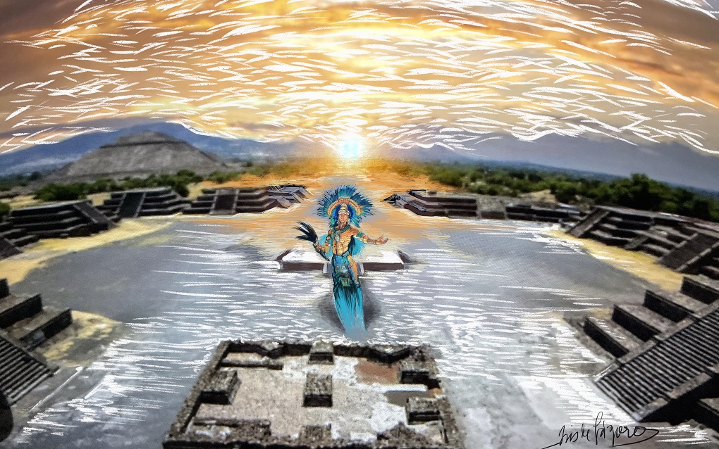Una vereda de tierra, entre los numerosos tianguis que ofrecen artesanías prodigiosas y leyendas, conduce a la Calzada de los Muertos. Atravesándola, con el asombro de quien irrumpe en un sitio sagrado, llegamos a la pirámide del Sol. Los escalones de piedra son un camino a las nubes. En el ascenso van levitando, poco a poco, el cuerpo y el alma. Habitan allí el tiempo y el silencio. Un punto mínimo de la cumbre concentra la luz, la energía, todo el astro que nos cuida cálidamente, que nos espiga. La pirámide llega lejos, y a sus pies, como enigma dormido, permanece Teotihuacán, la ciudad abandonada, de palacios y templos sobre cerros “hechos a mano” —los del Sol, la Luna y la serpiente emplumada Quetzalcóatl—; la ciudad de plazas, casas de amplios y numerosos aposentos y avenidas; la ciudad habitada en su momento de mayor esplendor, por más de 125 000 o 250 000 almas; bulliciosa y colorida, quizás como ninguna otra del mundo de entonces.