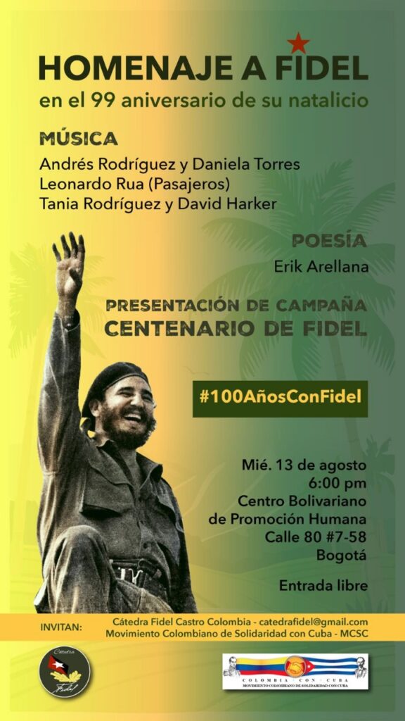 Y, como lo dijo Fidel: “basta ya de palabras, hace falta hechos”, en ese sentido, el día de hoy presentamos la campaña por el centenario de Fidel, es una campaña a nivel mundial, en Colombia hemos propuesto un programa y contamos con el apoyo desde Cuba del Centro Fidel Castro y del Comité Internacional Paz, justicia y dignidad a los pueblos, de este programa quiero destacar la campaña de recolección de donativos para el Centro Fidel Castro Ruz, institución pública destinada al estudio y difusión del pensamiento, la obra, la vida y el ejemplo del Comandante en Jefe que promueve la investigación, el acceso interactivo a la información y la permanente identificación del pueblo con sus valores. Esta iniciativa responde a las medidas impuestas por el gobierno de los Estados Unidos que han recrudecido el bloqueo, medidas que afectan a toda la sociedad y el Centro Fidel Castro Ruz no es la excepción. Les invitamos vincularse a esta tarea.