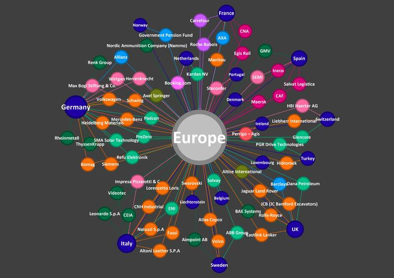 Empresas de Europa por Sector, País y Continente, Colores por Sector