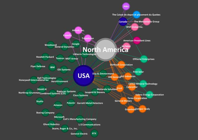En este trabajo de investigación no hemos incorporado a las empresas israelíes, sino sólo a las empresas e instituciones que se encuentran aportando desde el exterior a esta economía de ocupación y genocidio que sucede en territorio palestino. Como se trata de una hidra de mil cabezas, el análisis de redes nos permite observar cómo Europa y Estados Unidos, —sus Estados, sus empresas y sus instituciones— se dividen el trabajo y se complementan para construir esta maquinaria.