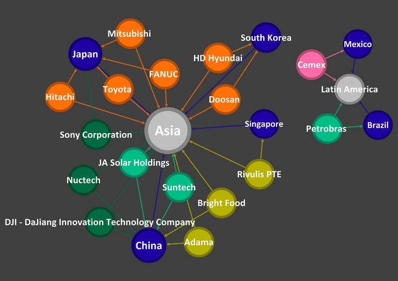 De los países asiáticos, China y Japón concentran la participación de esta región. Japón aporta sus históricas y famosas empresas Toyota, Hitachi, Sony y Mitsubishi, mientras que China tiene un rol menos relevante y centrado en las energías renovables —muy presentes en el entramado—. Finalmente, una empresa de Singapur y otra de Corea del Sur también terminan involucrando a estos países dentro de la máquina.