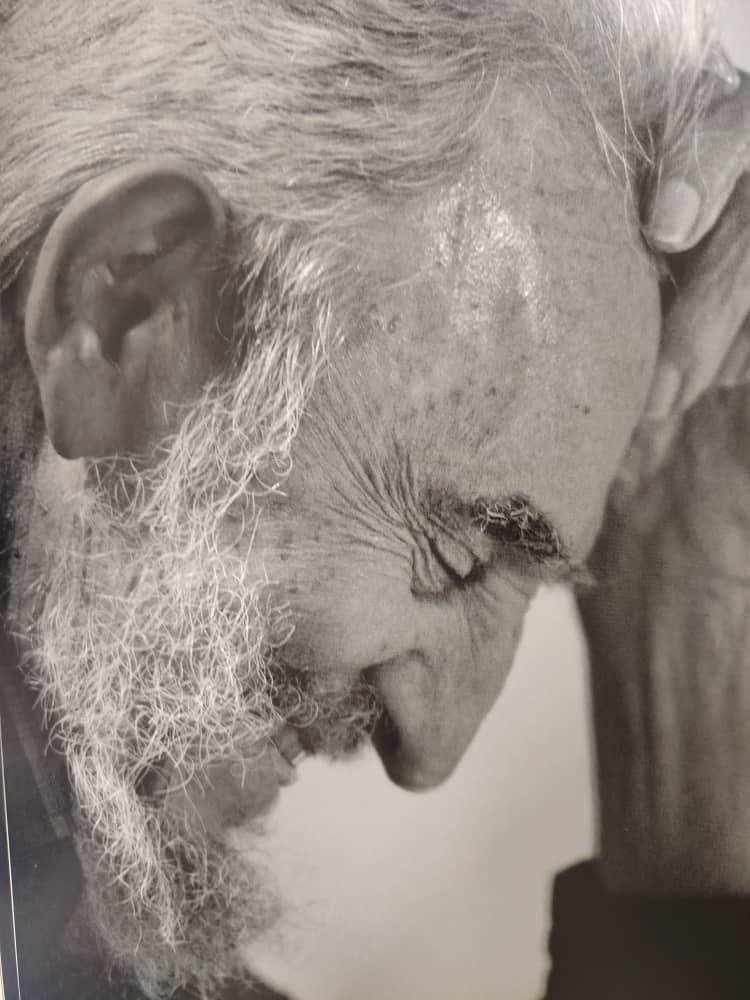 Destacaría una fotografía que despliega a toda lámina los insondables e infinitos claroscuros del blanco y negro. Fidel apoya la frente de sus meditaciones en una de sus manos. El pelo y la barba son un verdadero torrente de ideas sugeridas desde lo profundo. Su piel curtida es textura, corteza noble de árbol resistente que no se inclinó ante huracanes. El espíritu limpio emana de la cascada encanecida que es Fidel. Tiene una hidalguía desgarbada y quijotesca su perfil. Hombre que venció al tiempo, es lluvia copiosa que fluye hacia una sonrisa. Su presencia es el instante sublime por donde la luz asoma.
