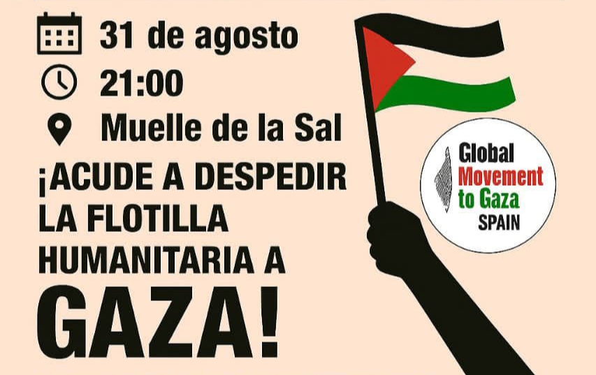 🗓️ El domingo 31 de agosto a las 21:00h en el Muelle de la Sal únete a un acto de solidaridad con Palestina y con la flotilla que intentará romper el criminal bloqueo que el ente israelí impone a Gaza desde 2007.