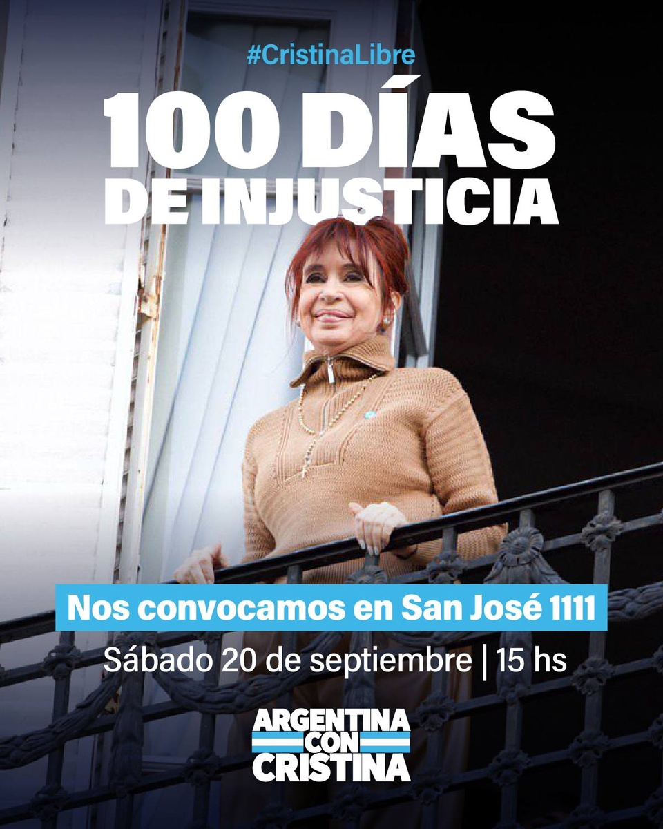 Una convocatoria a movilizarse en apoyo a Cristina Fernández de Kirchner a la dirección San José 1111 del barrio porteño de Constitución –donde la expresidenta cumple 100 días de la polémica condena a seis años de prisión domiciliaria e inhabilitación perpetua para ejercer cargos públicos–, comenzó a hacerse viral este jueves en las redes sociales. La consigna «Cristina Libre» es la que engloba a la iniciativa militante propuesta para este sábado desde las 15.