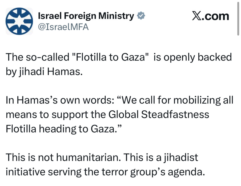 En redes sociales, el Ministerio de Asuntos Exteriores de Israel afirmó que la flotilla cuenta con el «respaldo abierto de Hamás». Esta declaración se produjo tras semanas de ataques coordinados en línea contra el convoy y sus participantes.