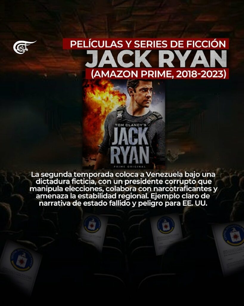 La serie Jack Ryan (Amazon Prime, 2019) sitúa su segunda temporada en una Venezuela ficticia gobernada por un dictador corrupto, rodeado de militares sanguinarios y mafias del narcotráfico. En la ficción, el país aparece como un Estado fallido donde el caos social solo puede ser contenido gracias a la intervención de un agente estadounidense.