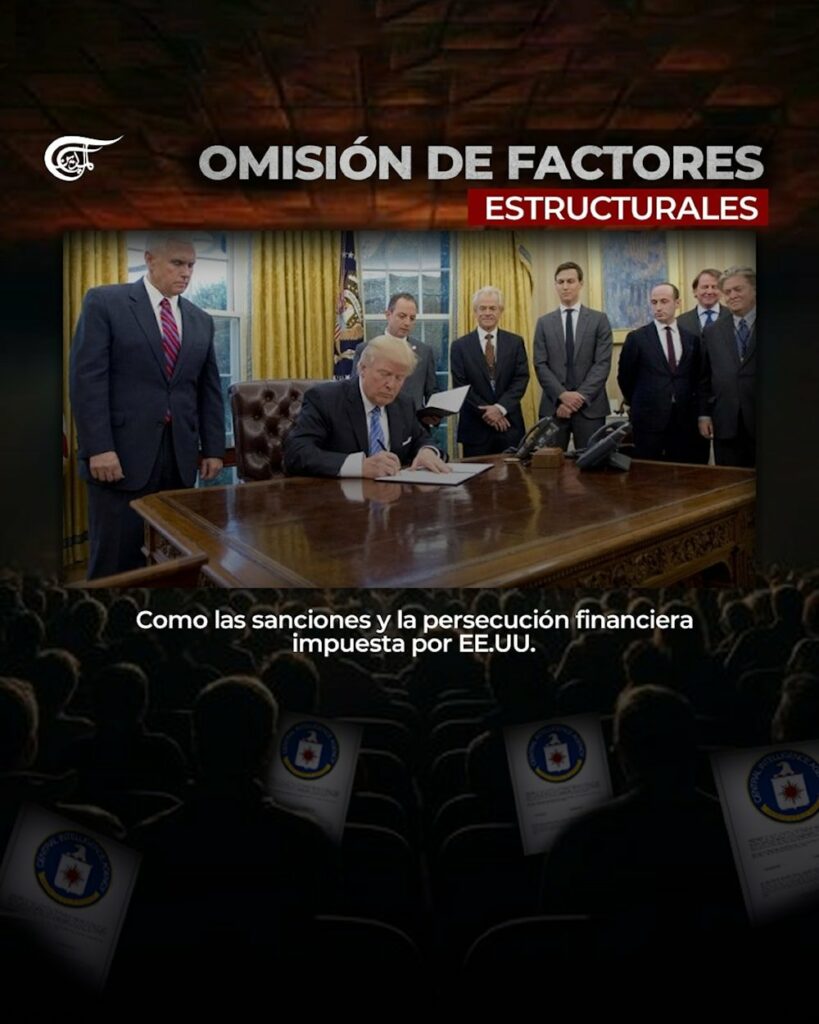 Al presentar la crisis como producto exclusivo de la supuesta “ineptitud gubernamental”, se omite el impacto de las medidas de coerción económicas impuestas unilateralmente por Estados Unidos y su injerencia constante en los asuntos internos del país.