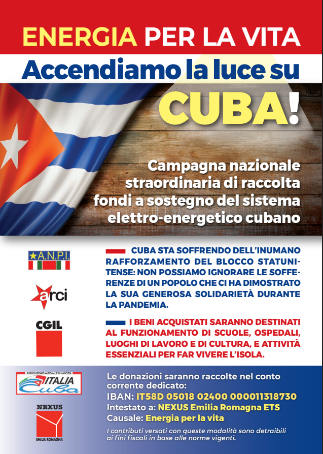 La Confederación General Italiana del Trabajo (CGIL),la Asociación Nacional de Amistad Italia-Cuba (ANAIC),la Asociación Recreativa Cultural Italiana (ARCI), Asociación Nacional de Partisanos de Italia (ANPI) y Nexus Emilia-Romagna, con el respaldo de la Embajada de Cuba en Italia y su Embajadora Mirta Granda Averhoff, lanzaron un llamamiento urgente: ¡unámonos para apoyar a Cuba!
