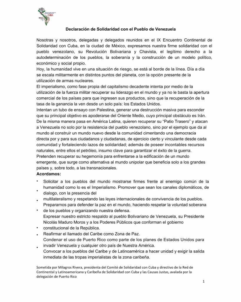 - Declaración de Solidaridad con el Pueblo de Venezuela: IX Encuentro Continental Latinoamericano y Caribeño de Solidaridad con Cuba
