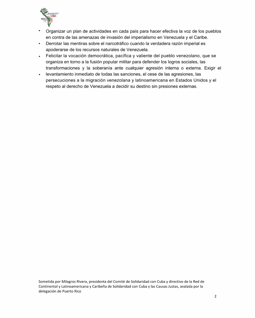 Asimismo, se expresó un firme respaldo a Venezuela y su Revolución Bolivariana, ante las amenazas de invasión y las sanciones injustas impuestas por Estados Unidos. Los participantes rechazaron el uso de Puerto Rico como plataforma para agresiones imperialistas y denunciaron el intento de reconquistar América Latina como «patio trasero».