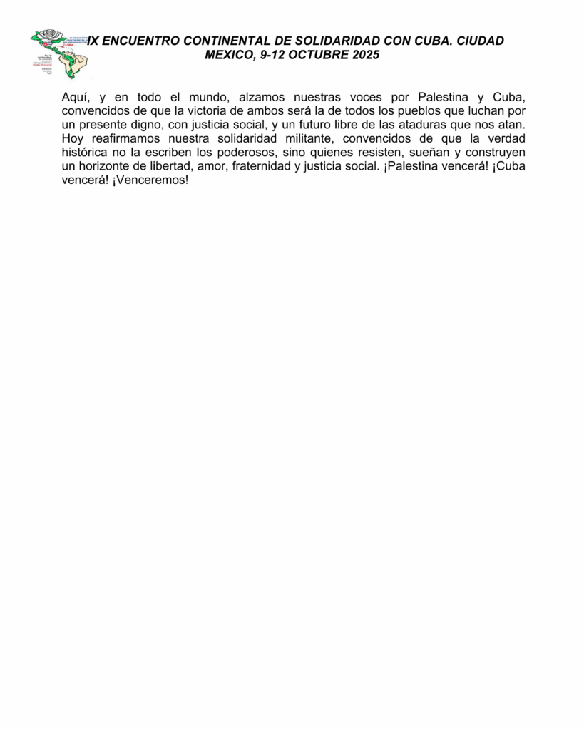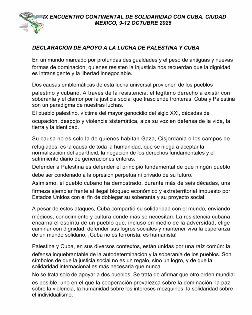 - Declaración de apoyo a la lucha de Palestina y Cuba: IX Encuentro Continental Latinoamericano y Caribeño de Solidaridad con Cuba
