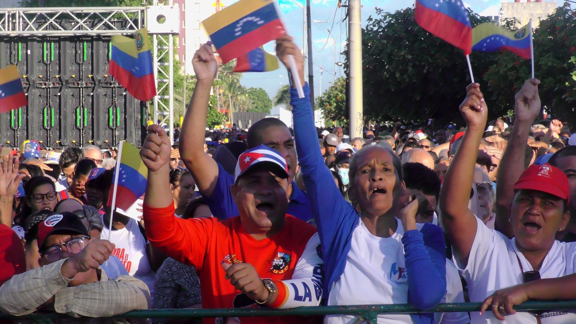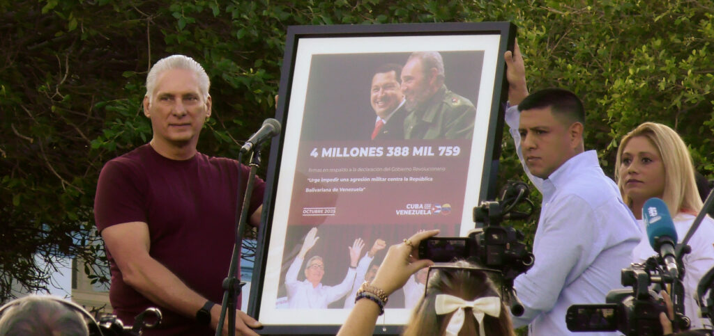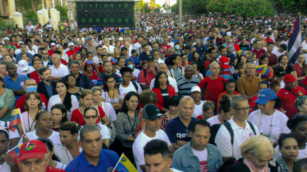 Más de cincuenta mil cubanas y cubanos acompañados por Miguel Díaz- Canel Bermúdez Primer Secretario del Comité Central del Partido Comunista de Cuba y Presidente de la República, el Primer Ministro Manuel Marrero Cruz, miembros del Buró Político del Comité Central del Partido, representantes de organizaciones de masas, dirigentes juveniles, miembros de las Fuerzas Armadas Revolucionarias y del Ministerio del Interior, cuerpo diplomático acreditado en Cuba, así como los delegados al III encuentro internacional de publicaciones teóricas de partidos y movimientos de izquierda, se juntaron para mostrar el apoyo directo y solidario a la hermana República Bolivariana de Venezuela que se encuentra ante la amenaza palpable del gobierno de los Estados Unidos que, bajo la justificación de combatir el narcotráfico han llegado a realizar un despliegue militar aeronaval descomunal en aguas del Caribe.