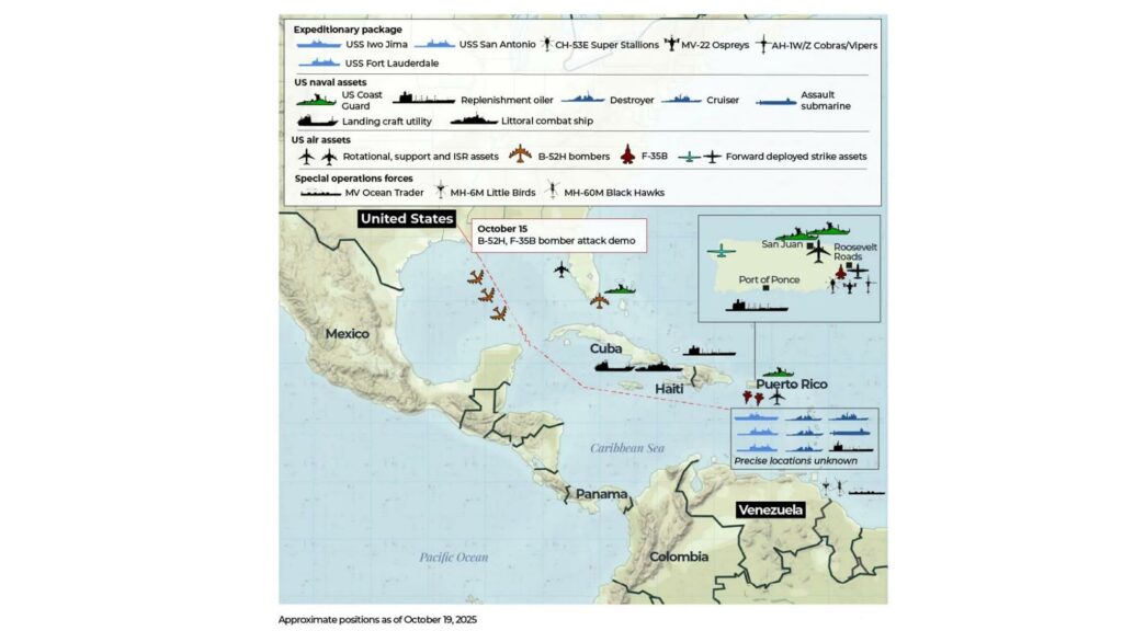 En las últimas semanas, Estados Unidos ha desplegado una flota naval y aérea de gran escala en el corazón del Caribe, configurando la mayor presencia militar en la zona desde la década de 1990. De acuerdo con fuentes del Pentágono y reportes visualizados por Al Jazeera Labs, el dispositivo involucra buques de asalto anfibio, cruceros, submarinos, patrulleros y aeronaves estratégicas, distribuidos desde Puerto Rico hasta las aguas cercanas a Venezuela.