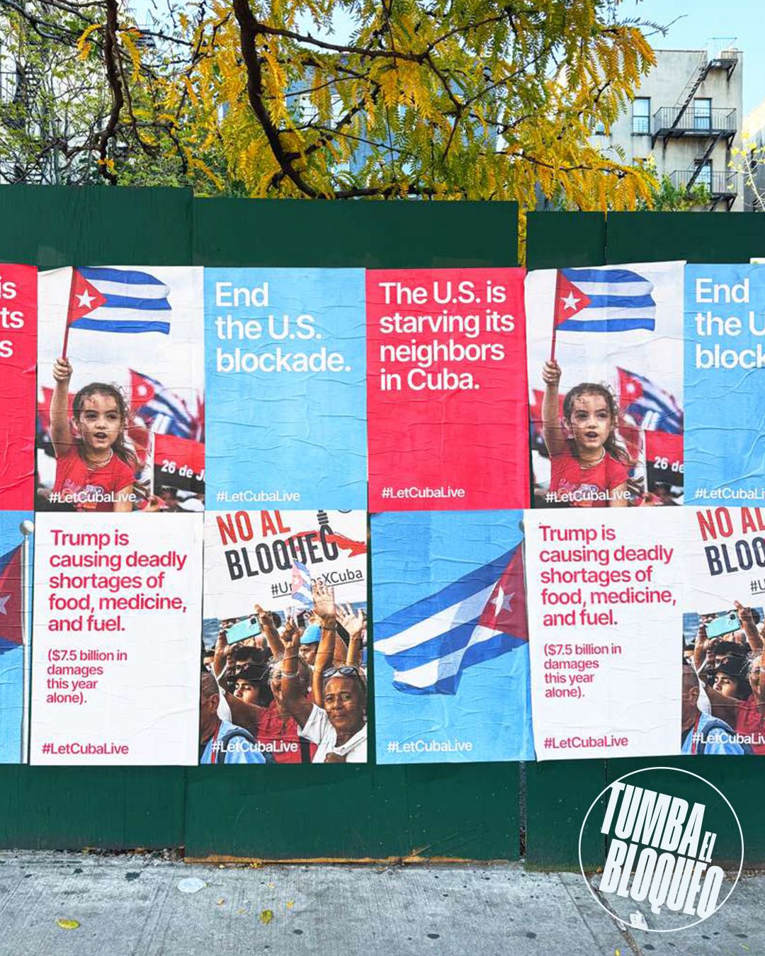 Cerca del edificio de las Naciones Unidas amanecieron ayer varios carteles que denuncian la guerra económica que, durante más de seis décadas, ha sostenido el Gobierno de Estados Unidos contra Cuba.