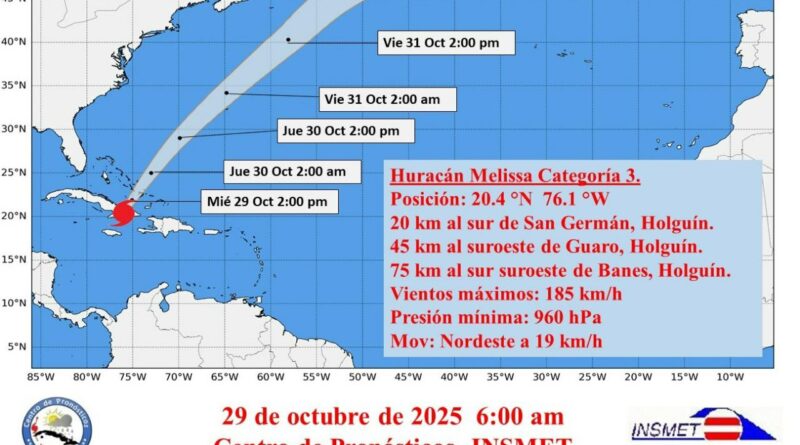 A la seis de la mañana, la región central del huracán Melissa se localizó por los radares cubanos en los 20.4 grados de latitud Norte y los 76.1 grados de longitud Oeste, posición que lo sitúa a unos 20 kilómetros al sur de San Germán, a 45 kilómetros al suroeste de Guaro y a 75 kilómetros al sur-suroeste de Banes, todas estas localidades pertenecientes a la provincia de Holguín. Melissa continúa moviéndose al nordeste, con una velocidad de traslación de 19 kilómetros por hora. En las próximas 12 a 24 horas se espera que el huracán Melissa siga debilitándose ligeramente en su interacción con tierra, mientras continúa moviéndose con un rumbo próximo al nordeste y similar velocidad de traslación. La región central de Melissa transitará sobre Holguín, saliendo al mar en la mañana por las inmediaciones del municipio Banes.