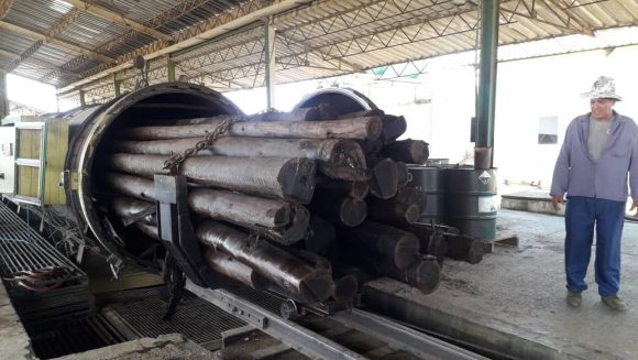 Las puertas del autoclave se abren, de él brotan los troncos de pino y eucalipto ya procesados y listos para su traslado por vía férrea para el oriente cubano.