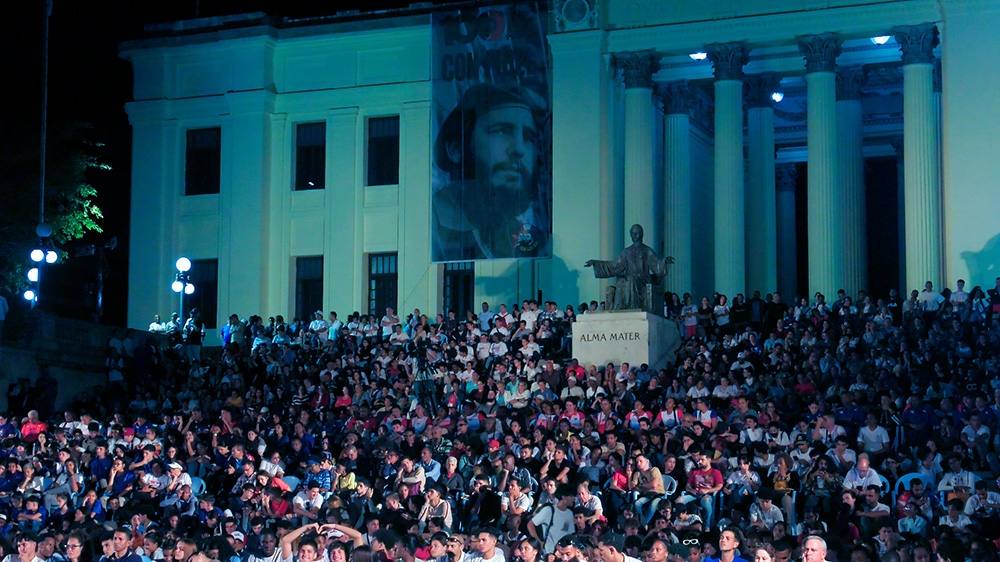 Ya entrada la noche se ofreció una velada político-cultural en la histórica escalinata de la Universidad de La Habana, lugar protagónico de la gestación del movimiento estudiantil revolucionario en la historia de Cuba.