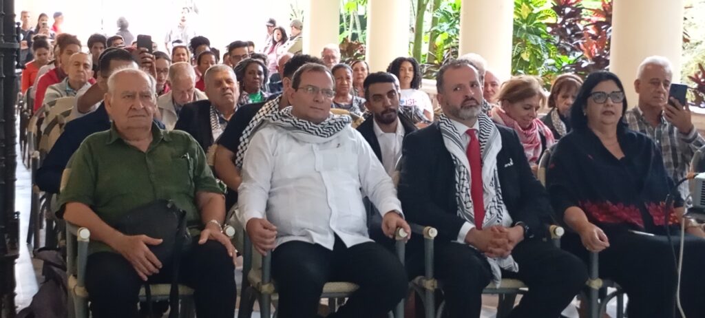 El acto como homenaje a la solidaridad de los pueblos del mundo con la causa palestina estuvo presidido también por el Exctmo.Sr. Ammar Zorba, Embajador del Estado de Palestina en la República de Cuba; Julio César Sánchez Martínez, funcionario del Departamento de Relaciones Internacionales del Comité Central del PCC; Armando Vergara Bueno, director para África Norte y Medio Oriente del Ministerio de Relaciones Exteriores de Cuba; Eumelio Caballero Díaz, presidente de la Asociación de Amistad Cubano-Arabe. La ceremonia fue honrada con la presencia de Haitham Arar, presidenta de la Unión General de la Mujer Palestina, la participación del Comité Internacional Paz, Justicia y Dignidad a los Pueblos, la distinguida presencia del cuerpo diplomático acreditado en Cuba, así como estudiantes y residentes palestinos que cursan estudios en centros docentes del país.