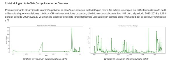 «Para examinar la dinámica de la opinión pública (sic), se diseñó un enfoque metodológico mixto. Se extrajo un corpus de 1,644 trinos de la API de X utilizando el query = (misiones médicas OR misiones médicas cubanas), dividido en dos subconjuntos: 481 para el periodo 2015-2019 y 1,163», dice 4Métrica.