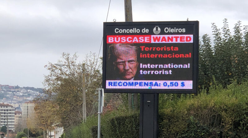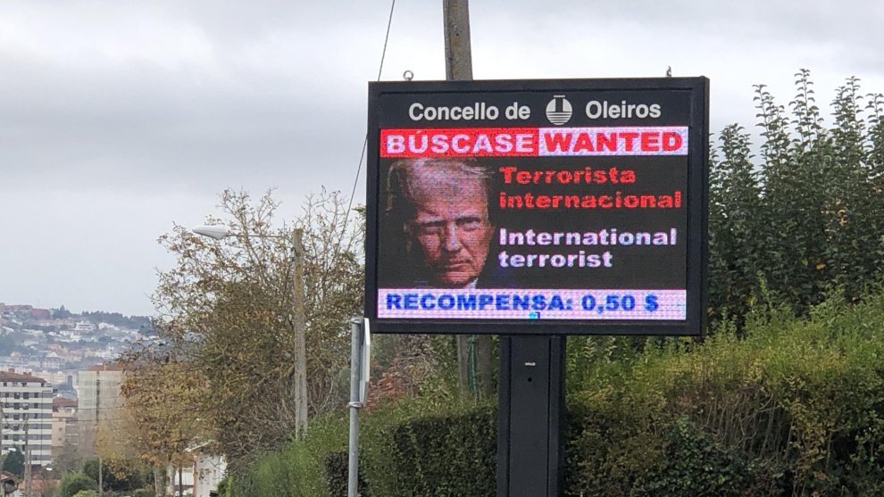 Los nueve luminosos municipales públicos repartidos por el concello de Oleiros (A Coruña) alternan desde esta semana los habituales anuncios de actividades culturales y de ocio organizadas por el Ayuntamiento con una imagen del presidente de Estados Unidos, Donald Trump, y un contundente mensaje redactado en gallego y en inglés: Búscase. Wanted. Terrorista Internacional. International terrorist. Recompensa: 0,50$.