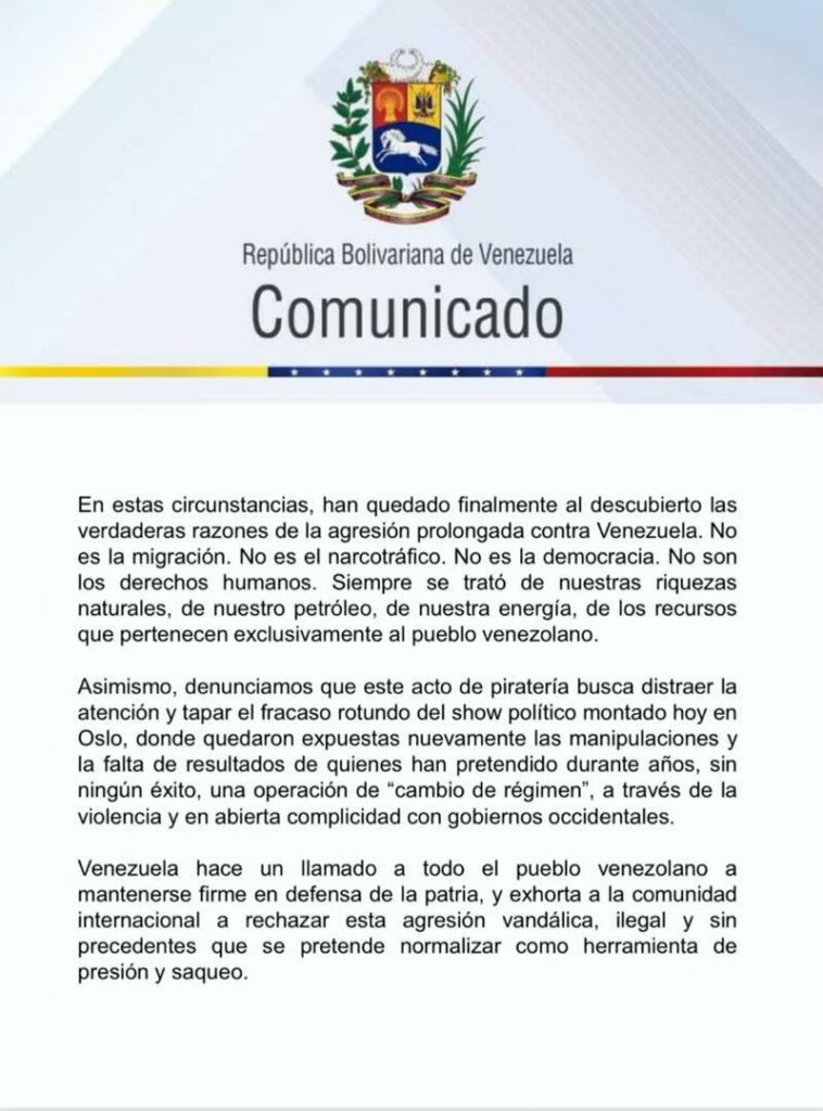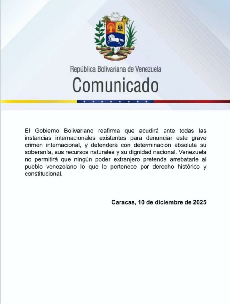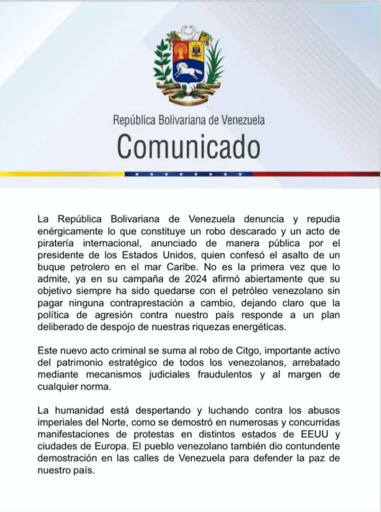 La República Bolivariana de Venezuela denuncia y repudia enérgicamente lo que constituye un robo descarado y un acto de piratería internacional, anunciado de manera pública por el presidente de los Estados Unidos, quien confesó el asalto de un buque petrolero en el mar Caribe.
