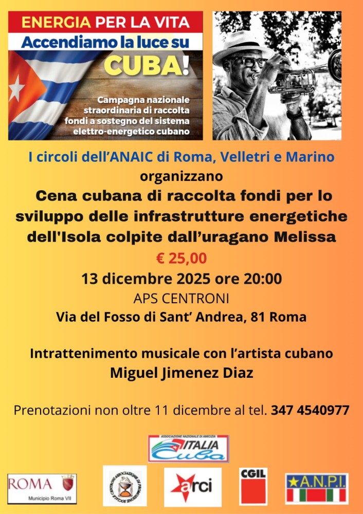 Los círculos de la Asociación Nacional de Amistad Italia-Cuba (ANAIC) de Roma, Velletri y Marino celebrarán el próximo 13 de diciembre de 2025, a las 20:00 horas, una cena cubana de recaudación de fondos destinada al desarrollo y recuperación de las infraestructuras energéticas de la Isla, gravemente afectadas tras el paso del huracán Melissa.