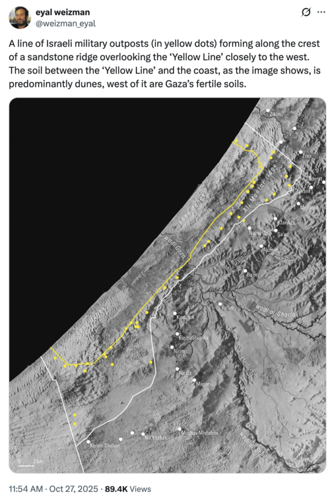 El trazado, establecido como parte del acuerdo de alto el fuego, recorre Gaza desde el norte, en Beit Hanun, hasta el sur, en Rafah, y deja alrededor del 53% del enclave bajo ocupación y control israelí. En la práctica, esta línea se ha convertido en un área extremadamente peligrosa: soldados israelíes disparan contra cualquier persona que intente acercarse o cruzarla, lo que ha provocado víctimas civiles palestinas y bloqueado el regreso de miles de desplazados. Además, la delimitación impide el acceso a viviendas y tierras agrícolas, agrava la crisis alimentaria y obstaculiza la llegada de ayuda humanitaria.
