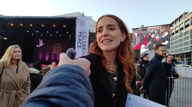 El jueves por la tarde, Día Internacional de los Derechos Humanos, tuvo lugar la entrega oficial del premio. Era evidente que muchos venezolanos pro-Machado habían acudido a Oslo. En el exterior, en el ayuntamiento donde se celebró la ceremonia, se podía seguir todo en una gran pantalla.