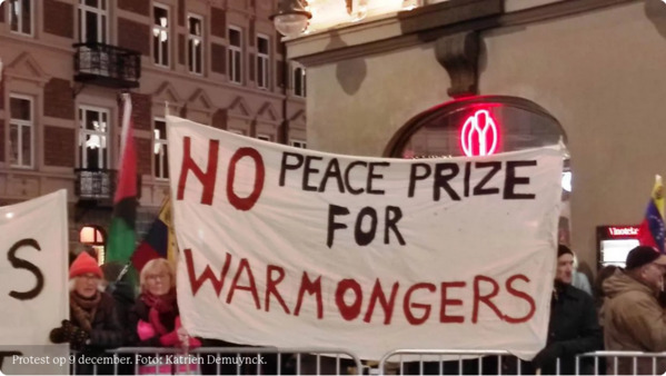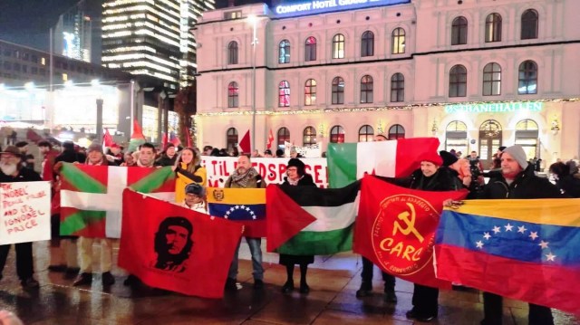 «Esta es la concesión más indignante del Premio Nobel en toda su historia, el primer Premio Nobel que fomenta y aprueba la intervención militar ilegal». Así calificó un participante noruego en las protestas la entrega del Premio Nobel de la Paz a la venezolana María Corina Machado el 10 de diciembre en Oslo.