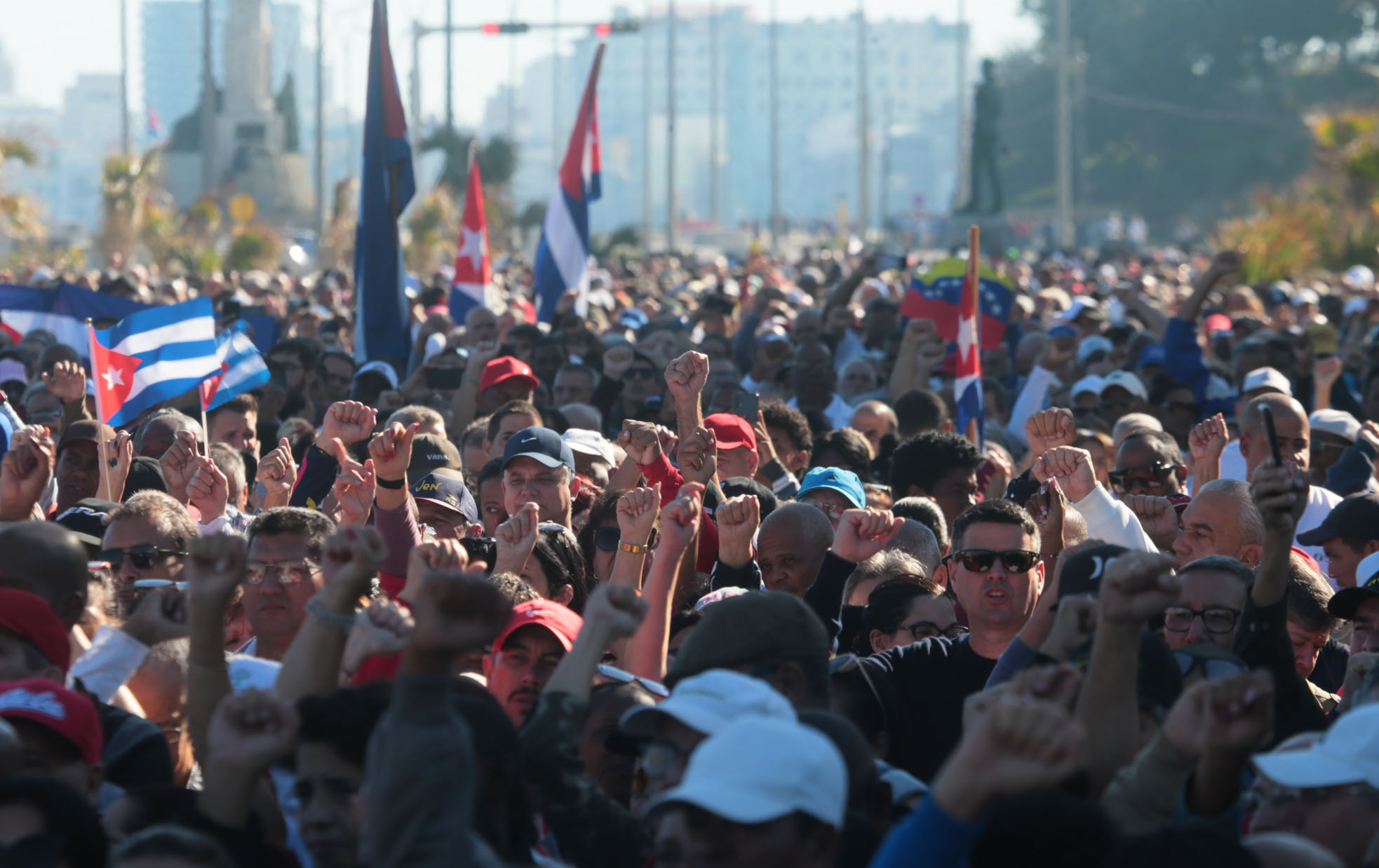 La Habana, 3 de enero de 2026.- Miles de habaneros en representación del pueblo de Cuba alzaron sus voces junto al presidente Miguel Díaz-Canel en la Tribuna Antimperialista, para condenar la brutal agresión estadounidense y secuestro del presidente constitucional Nicolás Maduro Moros, perpetrada en la madrugada de este 3 de enero en la República Bolivariana de Venezuela.