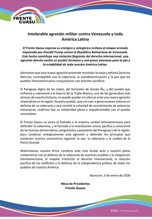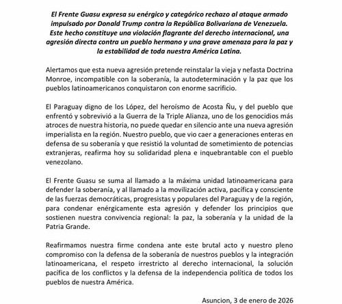 El Frente Guasu se suma al llamado a la máxima unidad latinoamericana para defender la soberanía, y al llamado a la movilización activa, pacífica y consciente de las fuerzas democráticas, progresistas y populares del Paraguay y de la región, para condenar enérgicamente esta agresión y defender los principios que sostienen nuestra convivencia regional: la paz, la soberanía y la unidad de la Patria Grande.