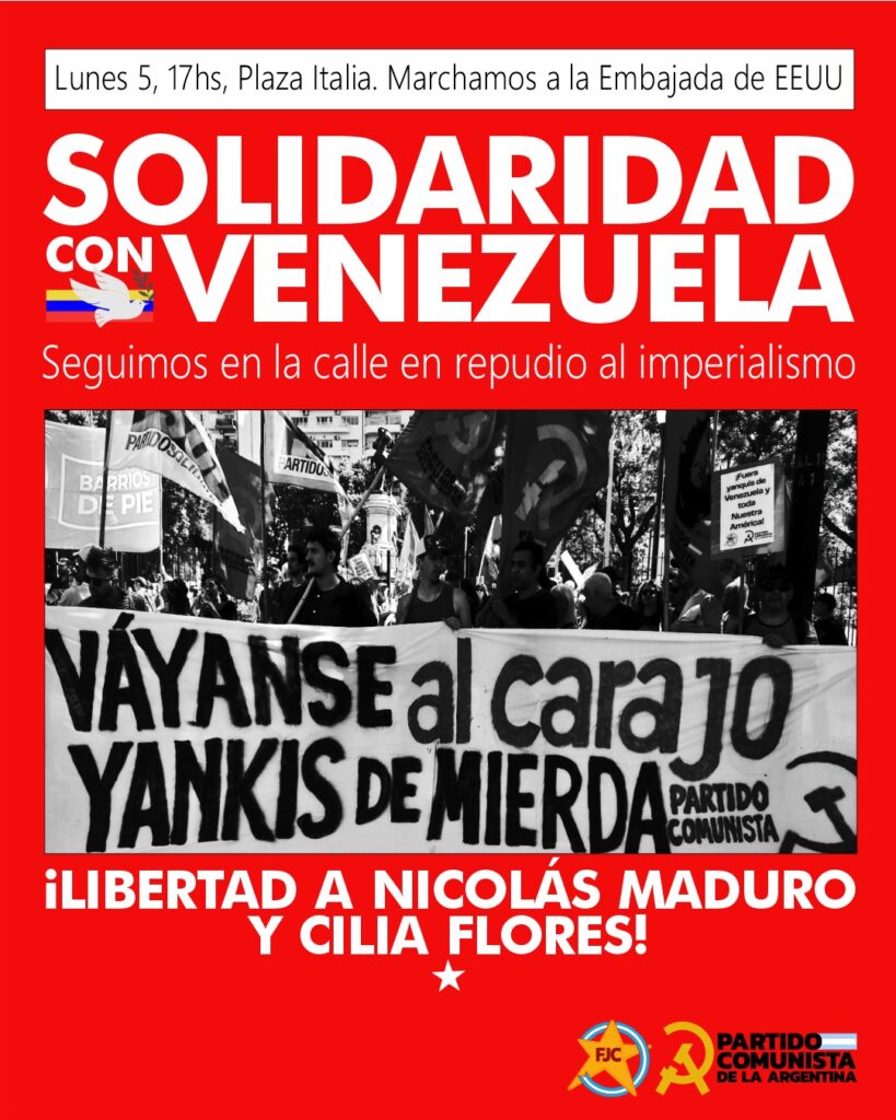 El Partido Comunista de la Argentina (PCA) convocó para el lunes 5 de enero a las 17 horas una movilización en repudio a la agresión imperialista contra Venezuela.