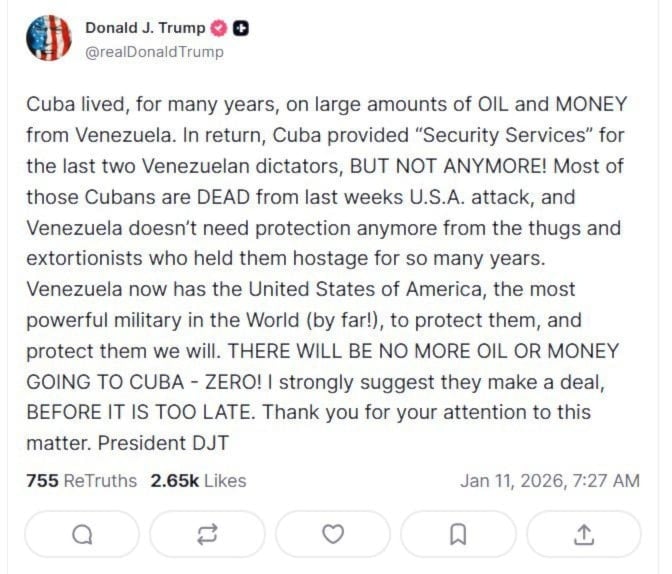 A su vez, las declaración ocurrió en respuesta a las advertencia del presidente Donald Trump, publicada en la en la plataforma Truth Social, en la cual manifestó: «No habrá más petróleo ni dinero para Cuba”.