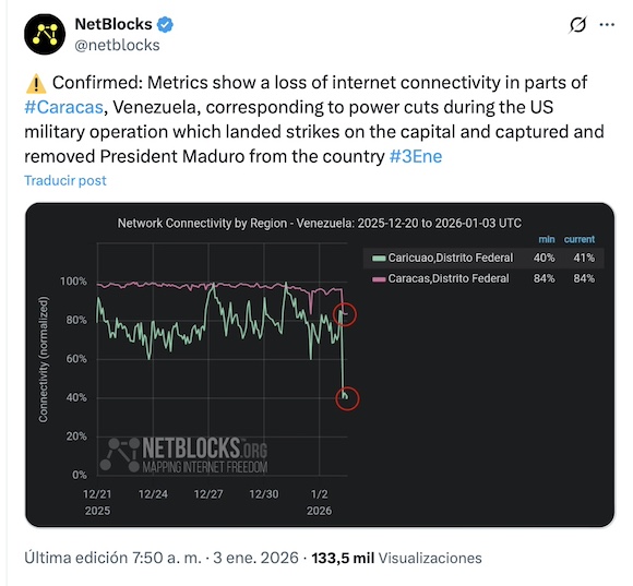 Horas antes y durante la operación, se registraron apagones significativos en áreas de Caracas, seguidos de una caída abrupta de la conectividad a Internet captada por ciudadanos venezolanos y medidores especializados internacionales.
