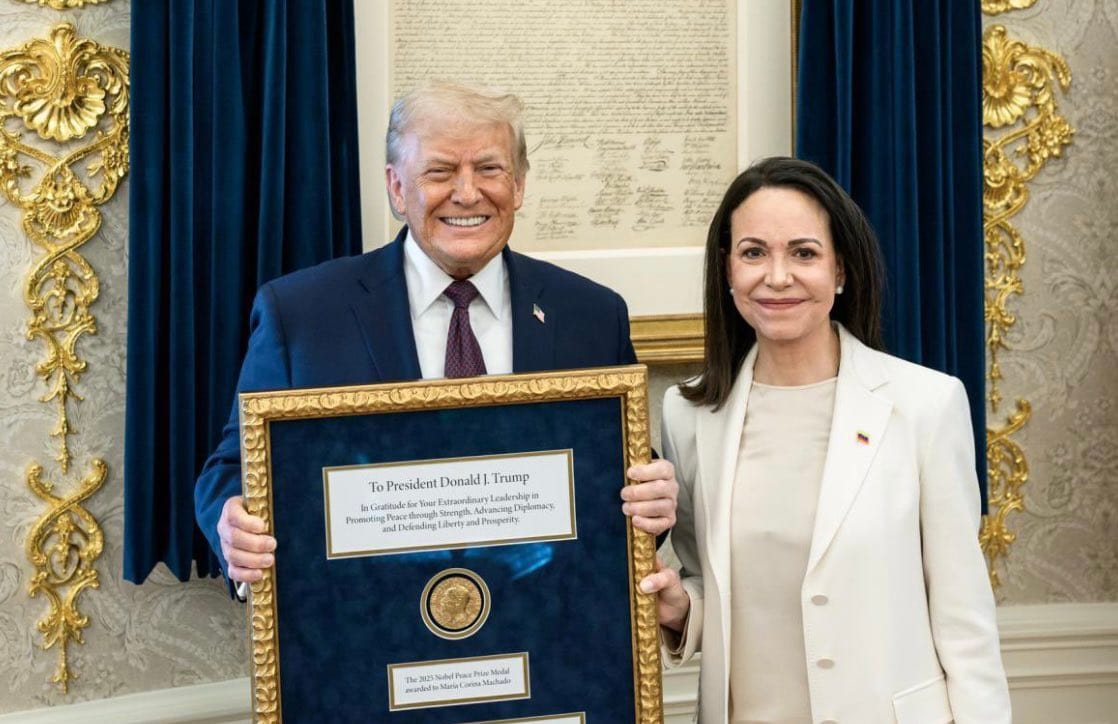 Machado le entregó el galardón auténtico de la medalla original del Premio Nóbel de la Paz 2025 (una pieza de oro de 196 gramos y 6,6 cm de diámetro) en el encuentro privado de casi dos horas en la Casa Blanca, durante una conversación en el Despacho Oval y un almuerzo. Trump celebró con una amplia sonrisa este gesto de auto humillación pública en su red social Truth al decir que era un «maravilloso gesto de respeto mutuo».