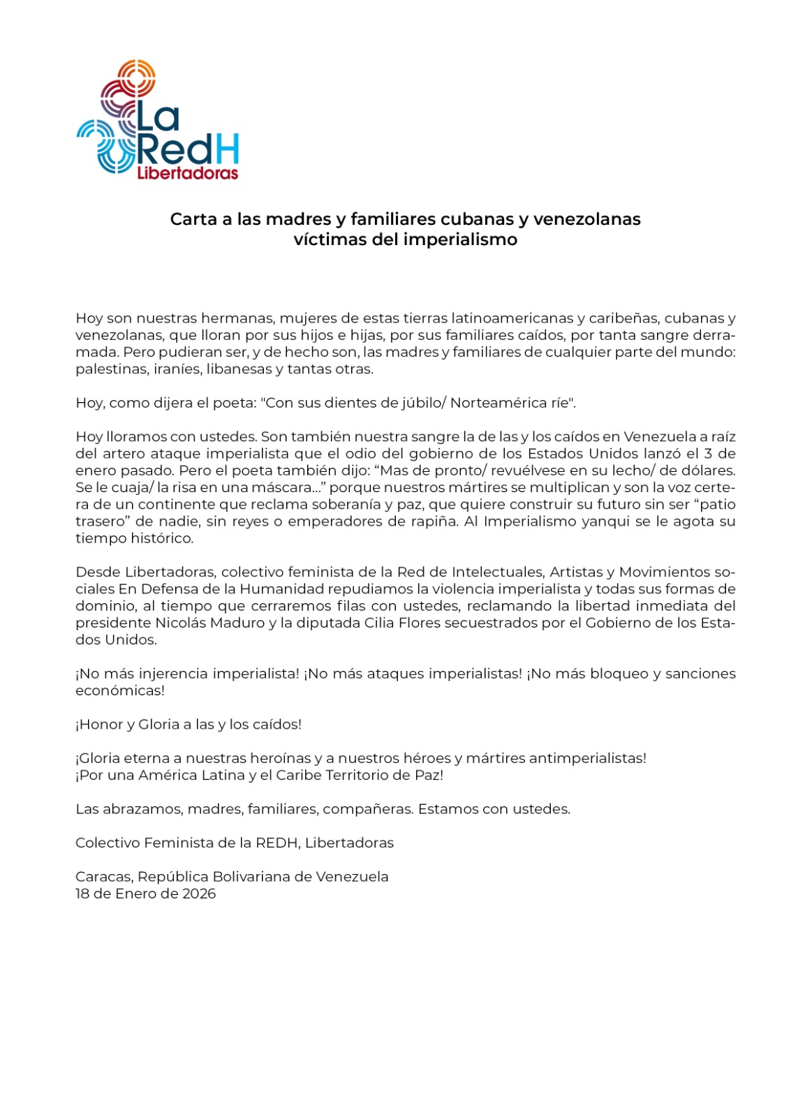 Desde Libertadoras, colectivo feminista de la Red de Intelectuales, Artistas y Movimientos sociales En Defensa de la Humanidad repudiamos la violencia imperialista y todas sus formas de dominio, al tiempo que cerraremos filas con ustedes, reclamando la libertad inmediata del presidente Nicolás Maduro y la diputada Cilia Flores secuestrados por el Gobierno de los Estados Unidos.