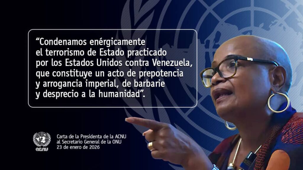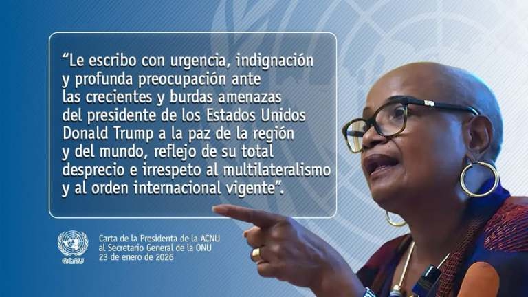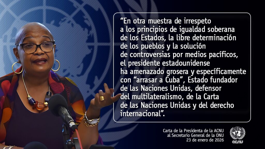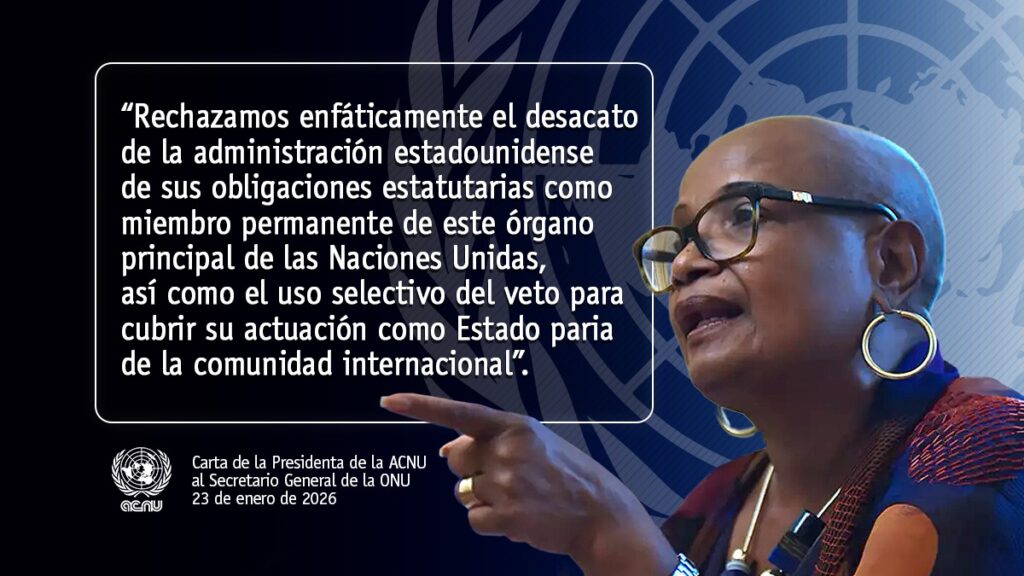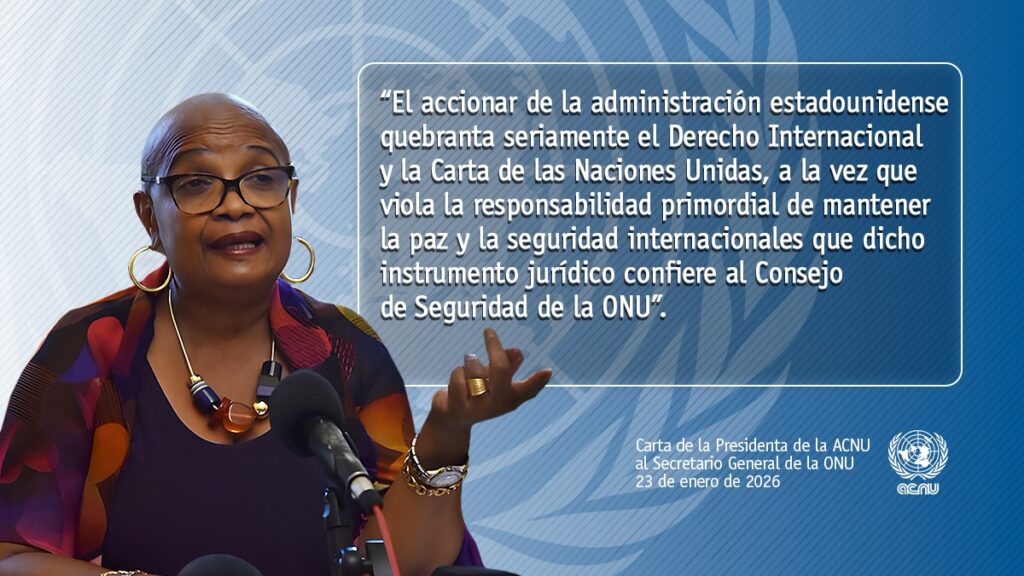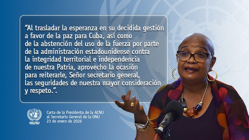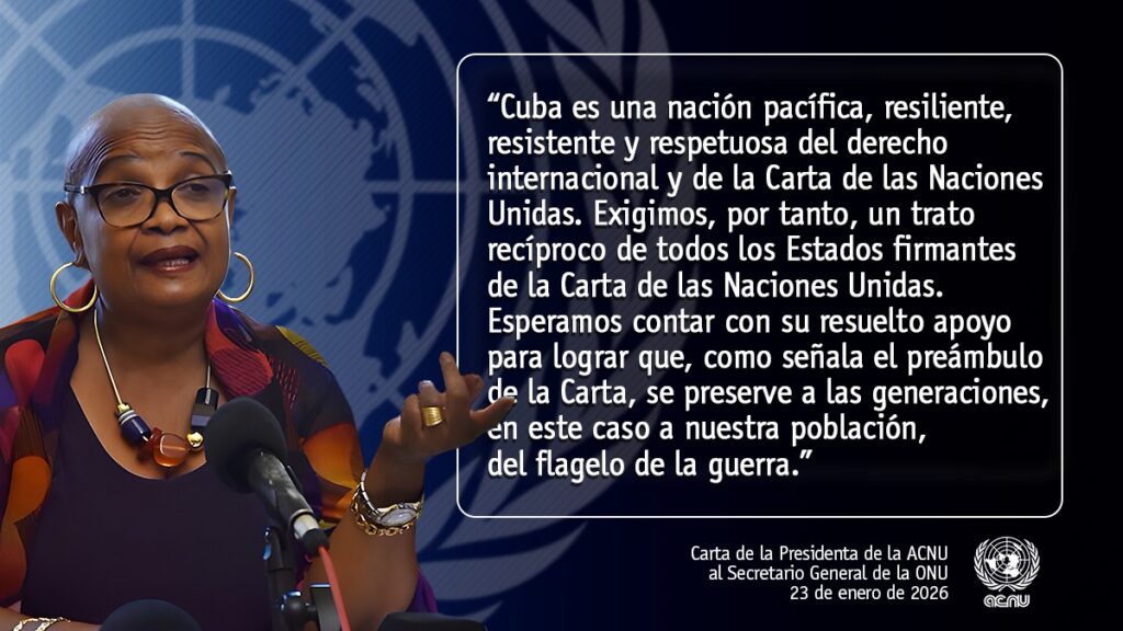 Esta solicitud, trasladada en una carta de la presidenta de la Asociación Cubana de las Naciones Unidas (ACNU), Norma Goicochea Estenoz, al Secretario General de la ONU, también expone cómo el accionar de la administración estadounidense quebranta seriamente el derecho internacional, a la vez que viola la responsabilidad primordial del Consejo de Seguridad de la ONU de mantener la paz y la seguridad internacionales.